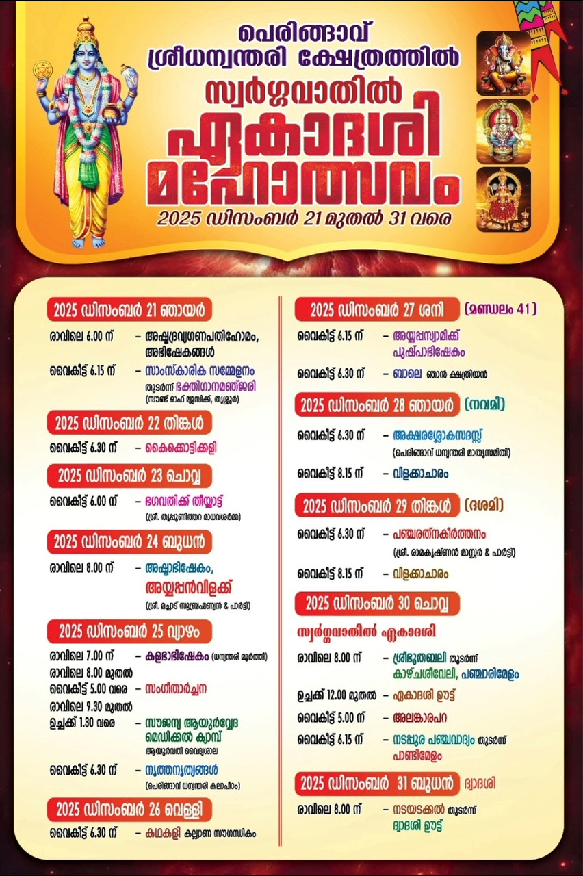 Swargavathil Ekadasi, also known as Vaikunta Ekadasi, is a significant Hindu festival celebrated on the 11th day of the bright fortnight in the month of Dhanu (December-January). It's a day when the gates of heaven, Vaikunta, are believed to be open, and devotees can attain spiritual liberation. Significance: • Opening of Heavenly Gates: According to legend, Lord Vishnu opens the gates of Vaikunta on this day, allowing devotees to enter and attain salvation. • Spiritual Growth: Observing fast and worshiping Lord Vishnu on this day is believed to bring spiritual growth, prosperity, and good fortune. Devotees take a single meal in the afternoon a day before Ekadashi day (Dasami) to make sure there is no residual food in the stomach on the next day. Devotees keep a strict fast with no food or water on Ekadashi day and break the fast on the next day (Dwadashi) only after sunrise. • Removal of Sins: It's said that fasting on Swargavathil Ekadasi can wash away sins and lead to moksha (liberation or freedom from rebirth). Celebrations: In our Sree Dhanwanthari Temple, the celebrations starts on 21-12-25 with a Cultural fete and ends with Dwadasi Oottu on 31-12-25 for around 1500 persons. For all these 10 days, there will be cultural programmes as shown in the above brochure and on 30th there will be 5 adorned elephants, Panchavadyam and Melam of renowned artist like Thriprayar Ramesan Marar, Kizhakkoot Aniyan Marar etc. Special Poojas and Vazhipadus are also done on those days. Aana Ekkam • Thidambu Aana – Rs.50000 • Edam valam aana-one only – Rs.40000 • Koottanakal one only – Rs.30000 • Aana chamayam – Rs.4000 • Kolathil Mala - Rs.3000 Special Udayastamana pooja – Rs.18000 Special Niramala Chuttuvilakku – Rs.5000 Special Niramala Chuttuvilakku- Ghee – Rs.7000 Kalaparipadikal one day Rs.10000 Melam for one person – Rs.2000 Deepaalankaram one day – Rs.10000 Neyyu 1 tin – Rs.2300 Neyyu ½ tin – Rs.1200 Enna 1 tin – Rs.1300 Enna ½ tin – Rs.700 Pushpalankaram – Rs.2000 Vilakkacharam – Rs. 10000 Kalabhabishekam – Rs.20000 Thyyattu – Rs.15000 Ashtabhishekam – Rs.10000